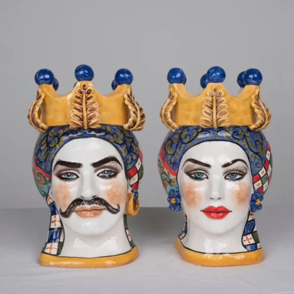 La testa maschile è caratterizzata da baffi neri arricciati, mentre la testa femminile presenta labbra rosse lucide, orecchini decorativi blu e uno sguardo elegante.