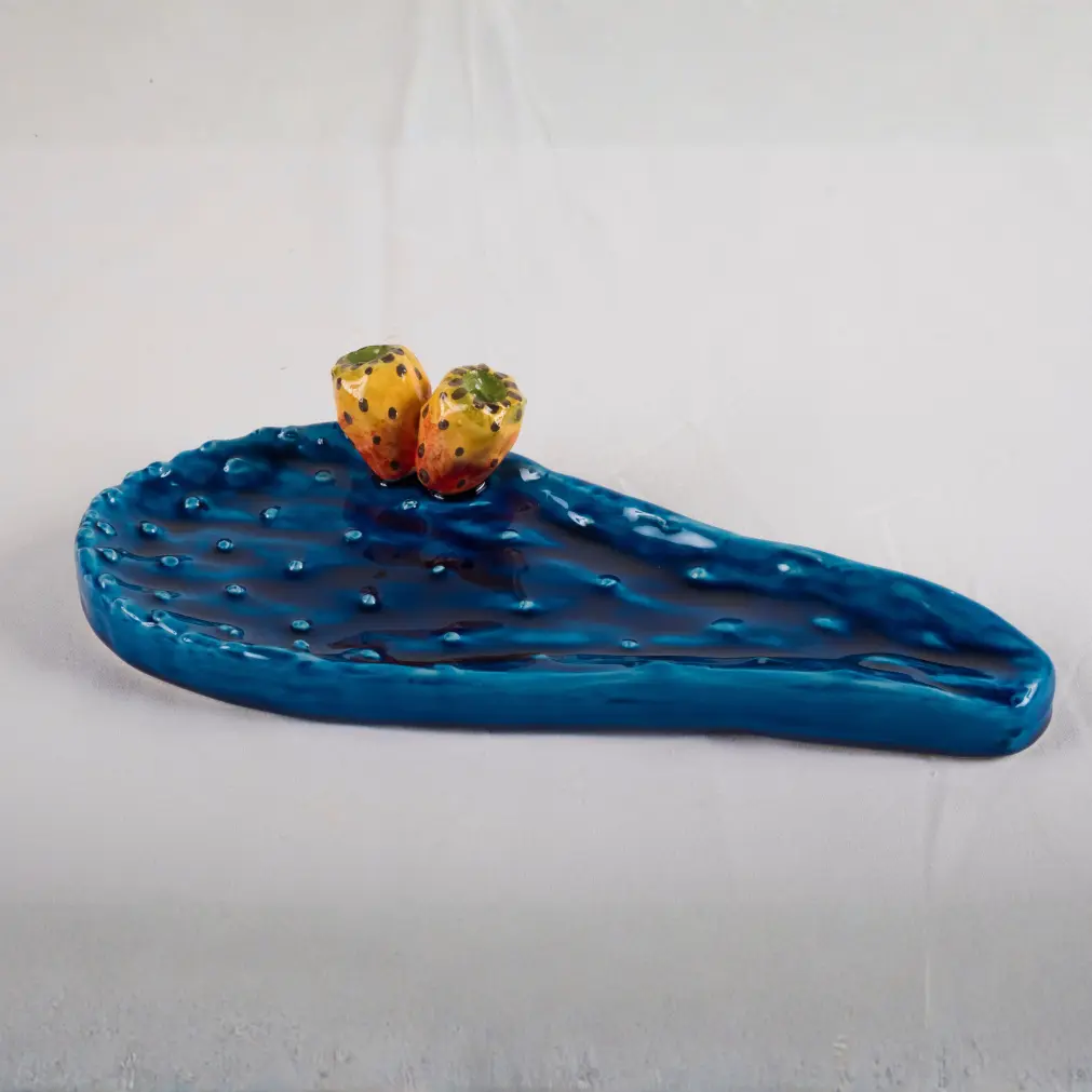 La decorazione è arricchita da due fichi d’India applicati in rilievo, dipinti nei toni caldi del giallo e arancio con dettagli puntinati, creando un contrasto cromatico vivace e armonioso.