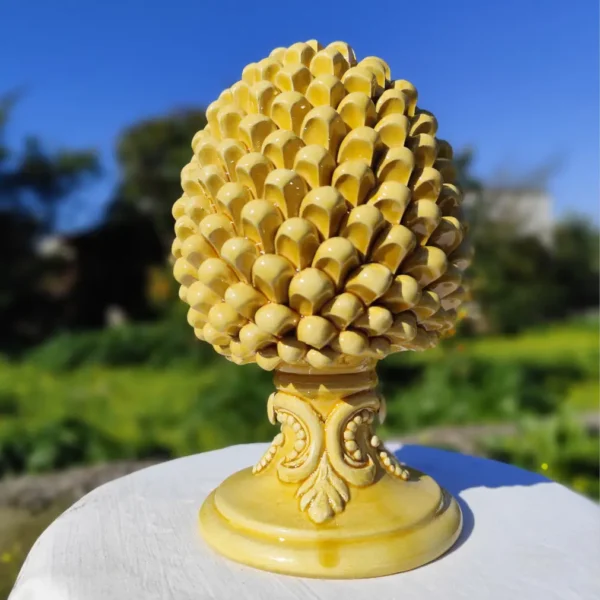 Pigne imperiali in ceramica smaltata artigianale, espressione raffinata della tradizione decorativa siciliana, dove la pigna rappresenta da secoli simbolo di prosperità, forza e protezione. La forma piena e maestosa, con sviluppo compatto e proporzioni armoniose, conferisce al manufatto una presenza scenografica di grande eleganza.